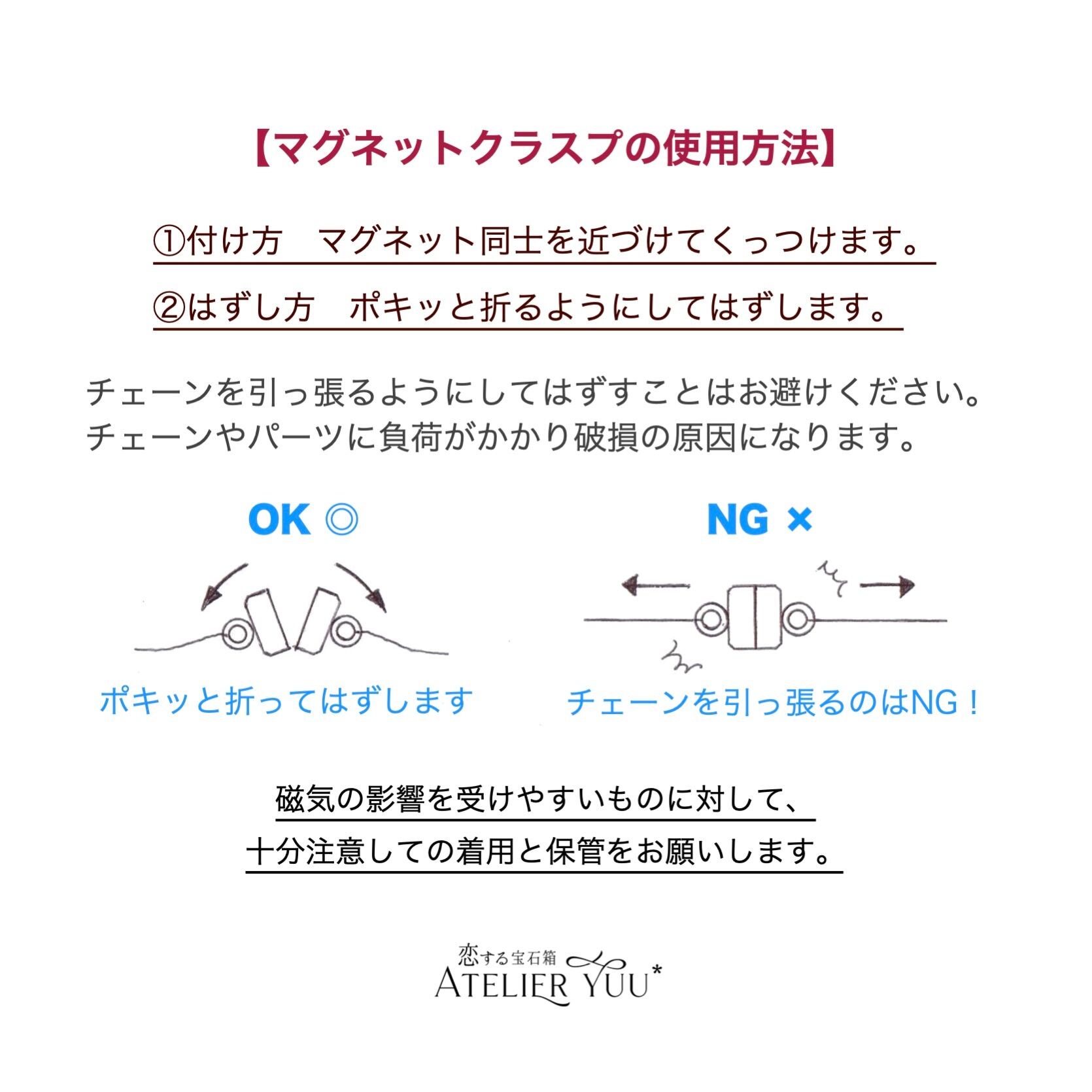 ◼️マグネットクラスプは強力な磁力を使用しています。強い負荷がかかった際には、安全のため外れる構造となっております。バッグや衣類の引っかかりなどにはご注意ください。